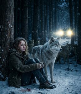 She whispered for help anyway, though the sound came out so weak it barely rose above the wind. Nothing answered. Only the trees. Only the soft hiss of air moving through pine needles. Only the kind of silence that makes a person understand how small they are. Then, just as her eyelids started to feel impossibly heavy, she heard something else. Branches snapping. Light steps. More than one. Not human. Not random. Purposeful. Closing in.