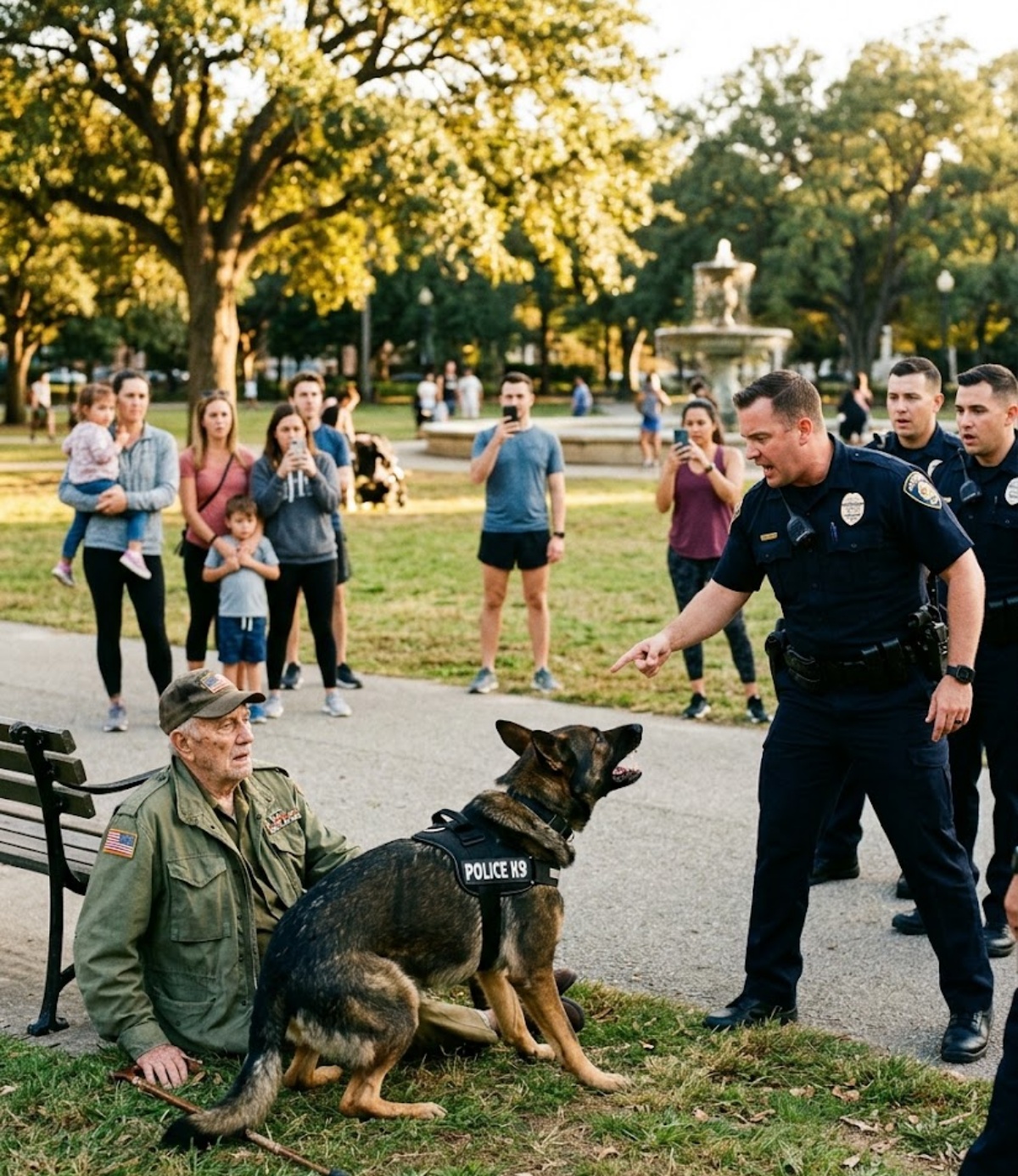 Broad shoulders. Stiff jaw. The expression of a man who was used to moving through the world as if certainty itself had been issued with his badge. Beside him was a K9 handler gripping the leash of a German Shepherd so striking that half the park froze on the sight alone.