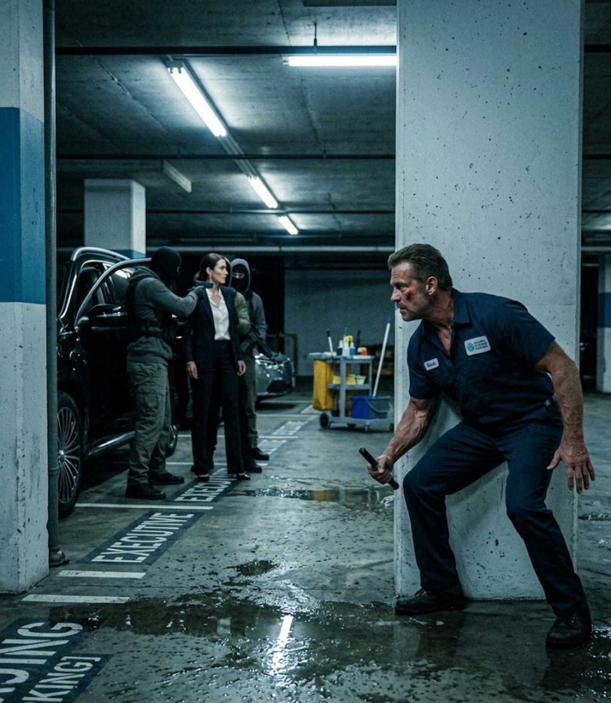 He moved through the darkness between one blink and the next, killing the garage lights with a slap of the maintenance panel as he went. The fluorescent hum cut out. The world fell into emergency red and shadow. The first man made a sound that was more surprise than pain before he went down. The second reached under his jacket and lost the use of his right arm in the same second, screaming as the janitor twisted and drove him face-first into the side of the SUV. The leader dragged Victoria up by her shoulder and turned the gun toward the motion, but the janitor was already inside the line of fire, one brutal movement taking the wrist, another taking the weapon, another dropping the man hard enough that the concrete did the rest.