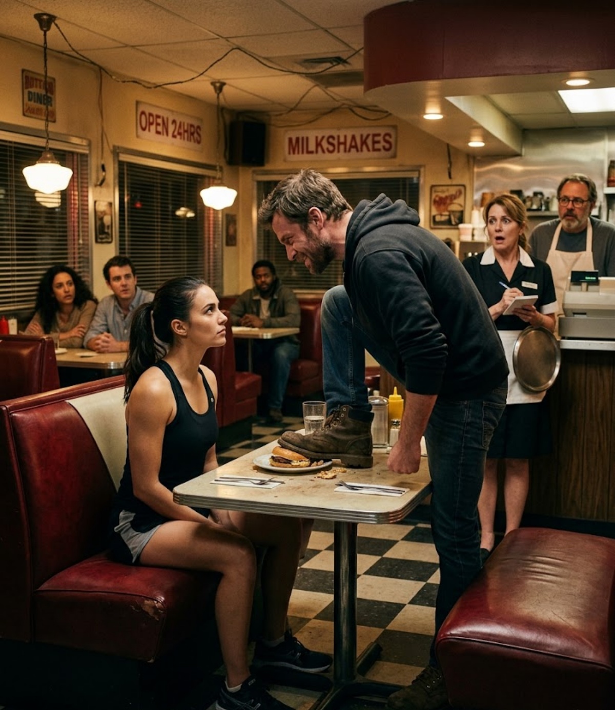 His boots struck the floor louder than they needed to, which was the point. He stopped just short of the table and looked down—not at her face at first, but at her meal. A burger. Fries. A plate that smelled like salt and heat and simple comfort. Something honest. Something harmless. His mouth curved as soon as he saw it, because cruel men often understand exactly what to destroy if they want to send a message.