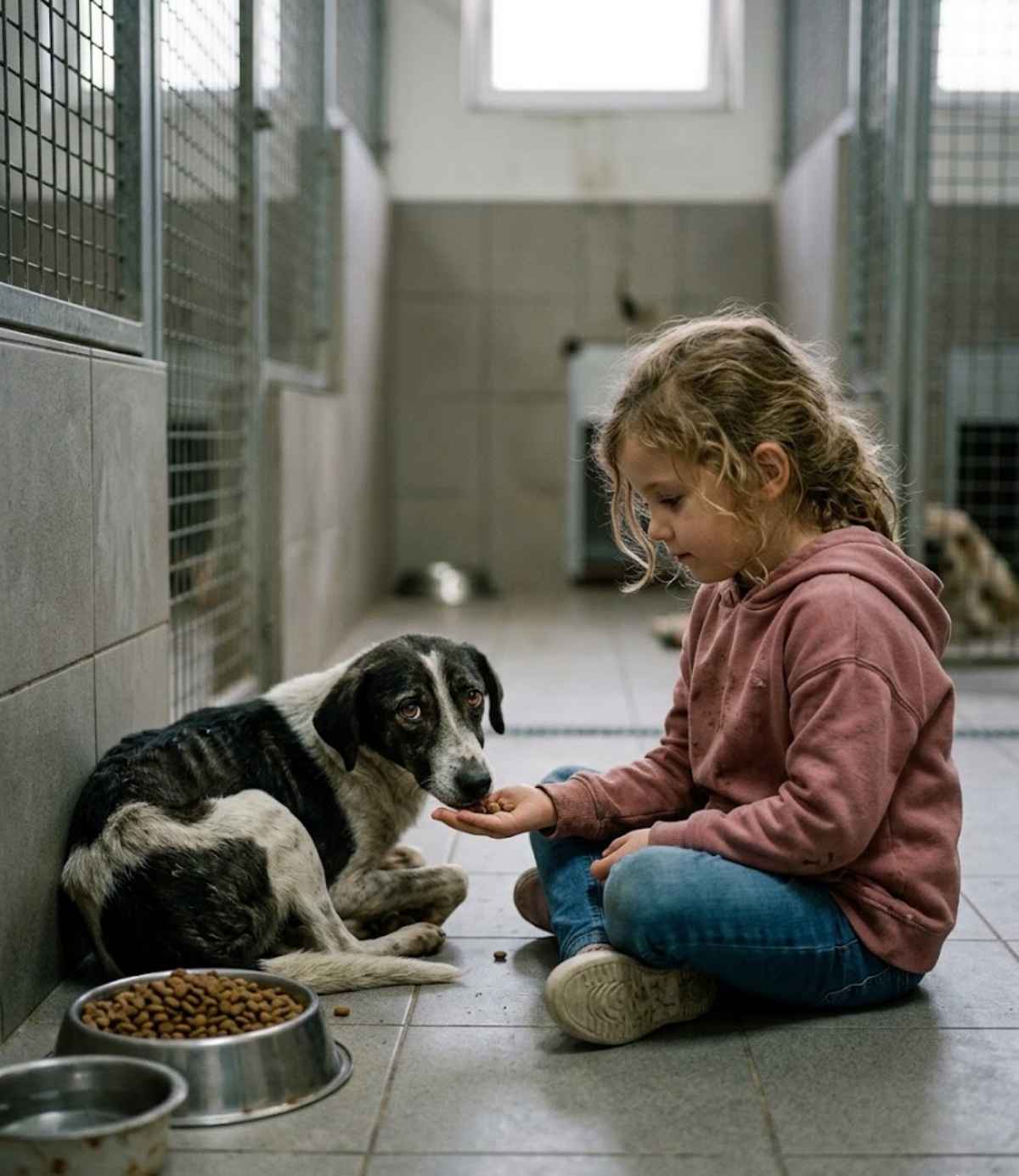 **At the end of a shelter hallway, one starving dog had stopped eating, stopped hoping, and almost stopped living. Adults tried everything. Nothing worked. Then a six-year-old girl sat on the floor beside him, held out a tiny piece of food, and waited. That single moment changed the rest of both their lives—because sometimes the ones everyone else walks past are only waiting for the one heart patient enough to stay.**