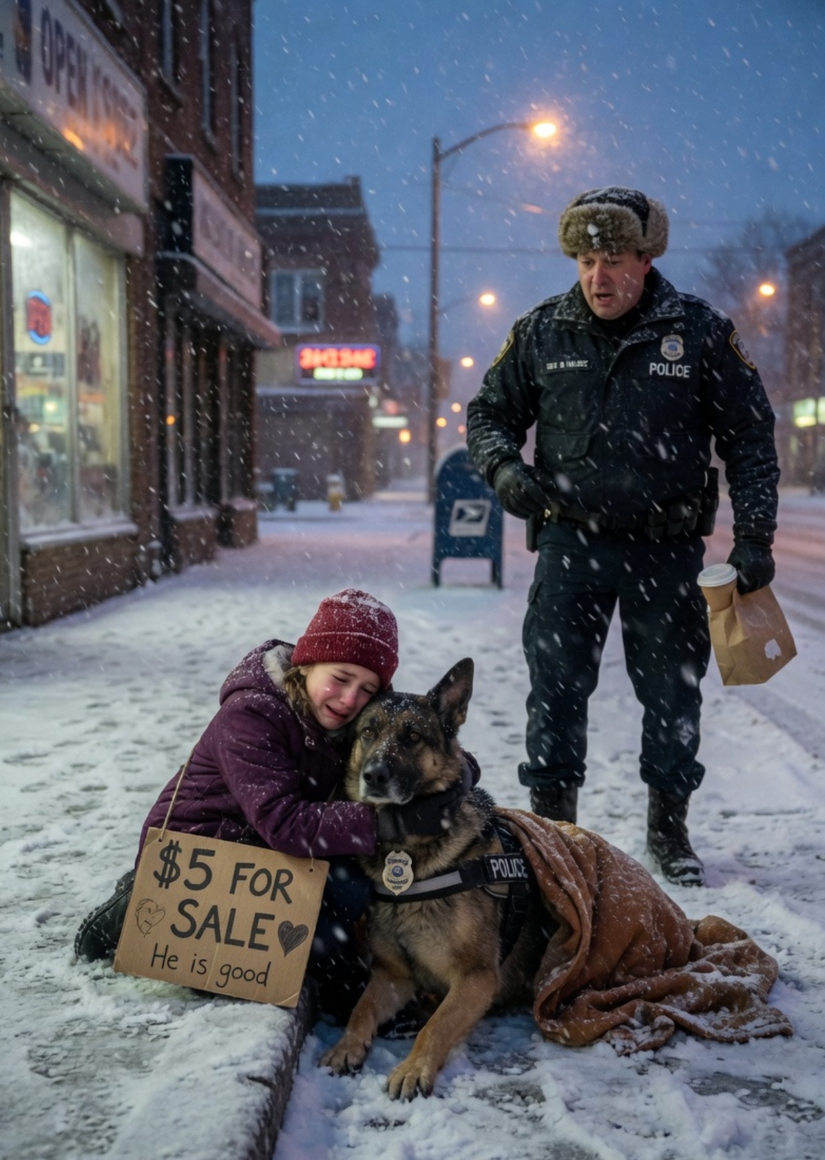 Snow was falling hard when Officer Daniel saw a little girl sitting alone on a frozen sidewalk beside a German Shepherd with a cardboard sign that read: $5 FOR SALE.