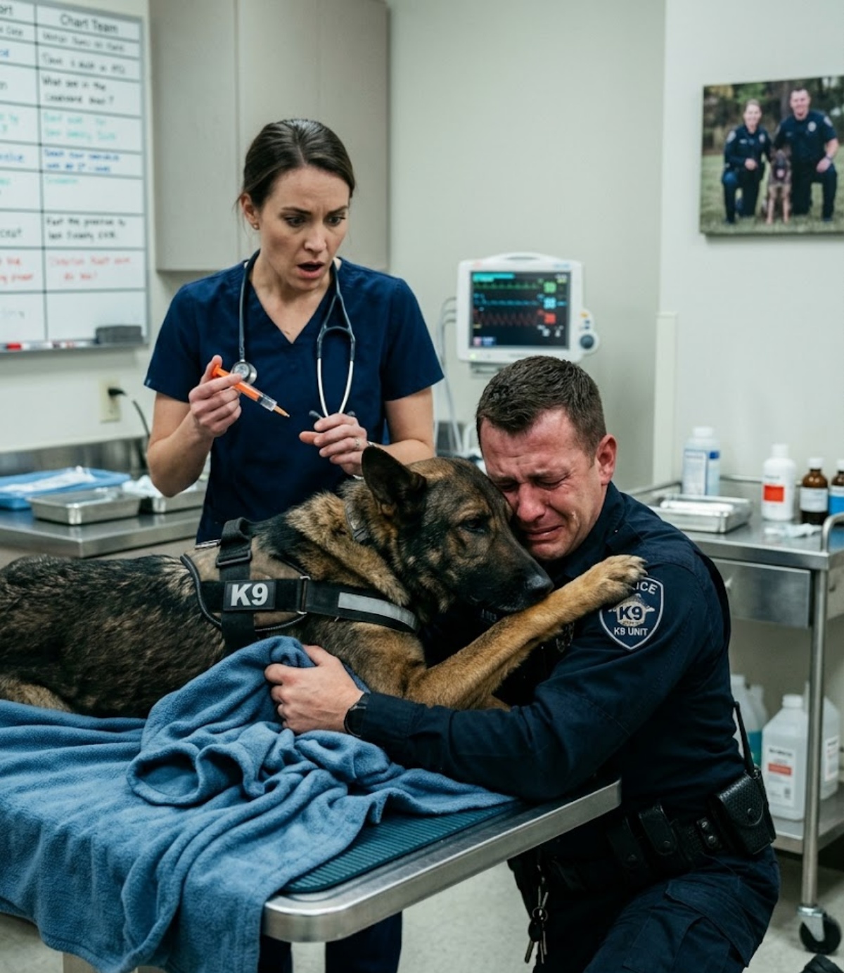 At 8:15 in the morning, Officer Luke Carter walked into the emergency veterinary clinic carrying seventy-five pounds of dying loyalty in his arms.
