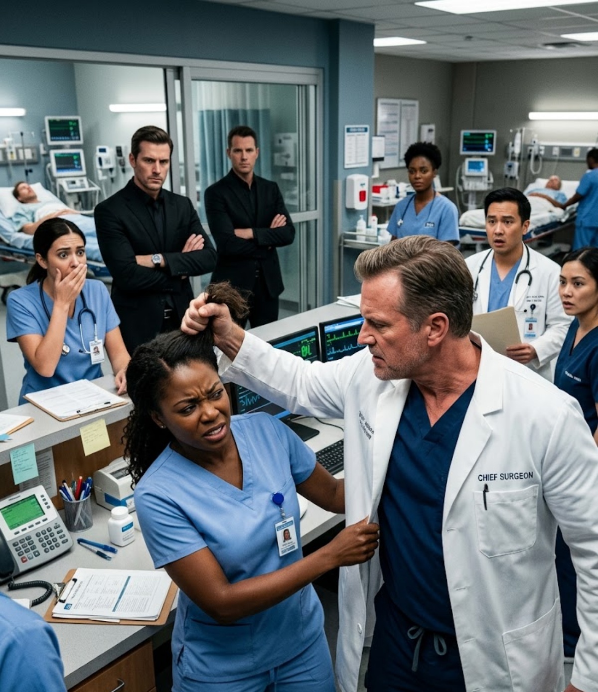 The pain was immediate — the kind that shoots from scalp to spine so quickly it feels electric. Her pen dropped. The chart slipped. The entire station froze as if someone had cut the oxygen in the room.