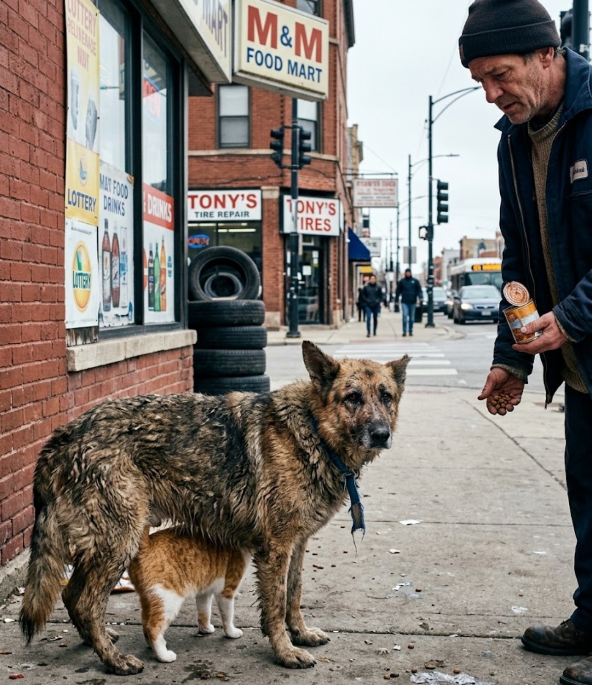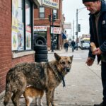 I poured some out near the alley behind the store, farther away from him, and left before he moved. I don’t know what I expected—gratitude, maybe, or some kind of dramatic movie moment where he looked up and we bonded instantly. Nothing like that happened. I set down food. I walked away. A few minutes later, when I glanced back from the curb, he had gone over and eaten.