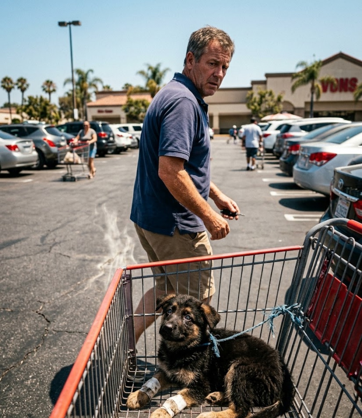 **She was left tied to a shopping cart in the heat like she didn’t matter. Weeks later, she walked out wearing a collar that said “Home.” And somewhere between those two moments, the man who thought he had no room in his life for a dog discovered that the abandoned puppy he rescued had quietly rescued him too.**