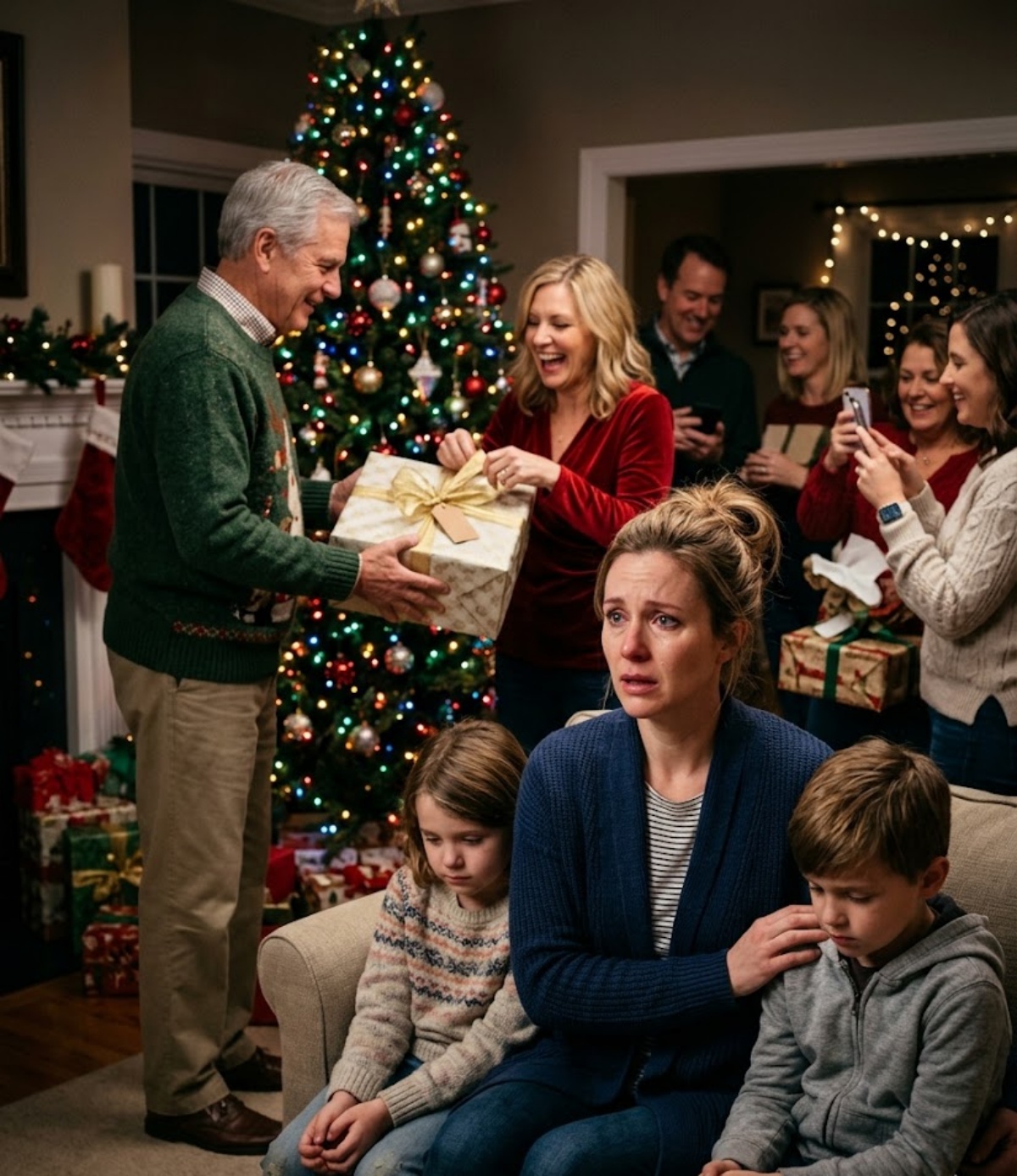 There were candles glowing in the windows, expensive wrapped gifts stacked beneath the branches, phones out to capture “memories,” and that particular kind of holiday cheer that only works when everyone agrees to ignore what’s happening underneath it.