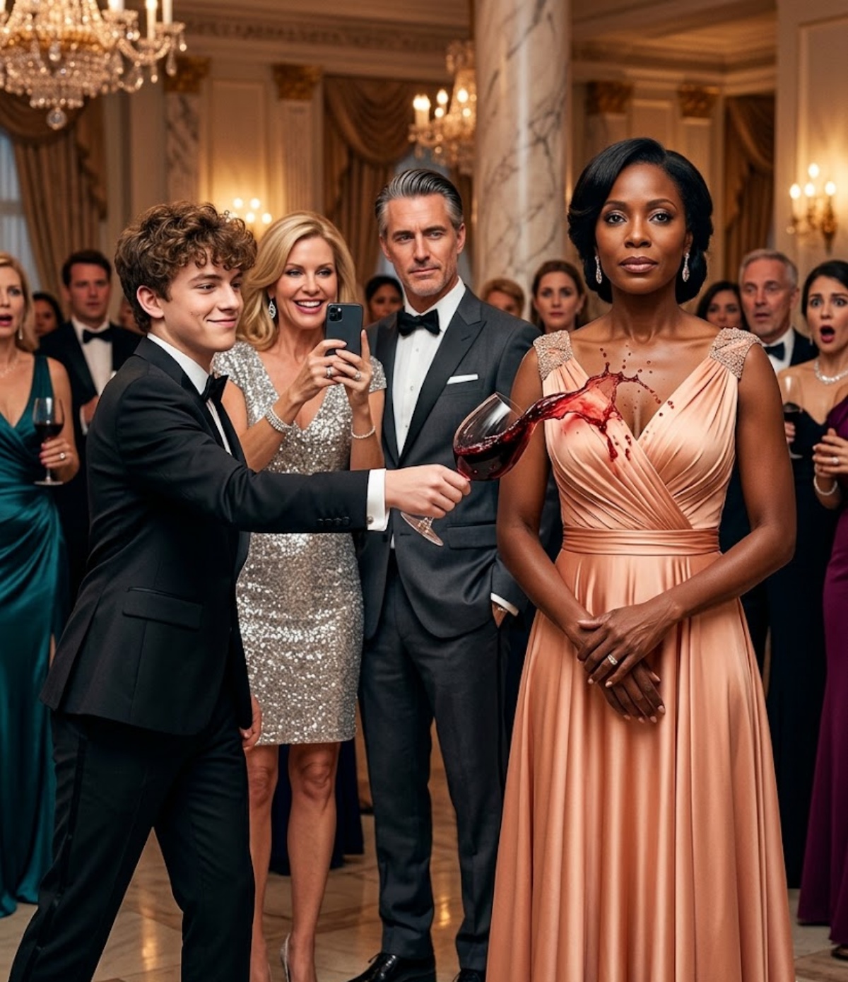 The red spread across peach silk in a violent bloom, darkening the fabric instantly. Wine ran down her skin, soaked into the folds of the dress, dripped onto marble. For one suspended second, the ballroom stopped breathing.