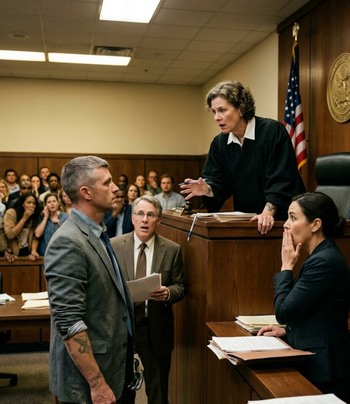 One second earlier, she had been ready to sentence Michael Anderson to ten years in state prison. The words were already arranged in her mouth, the clean, practiced language of punishment. Then the defendant took off his jacket in the suffocating July heat, pushed back the sleeve of his white shirt, and exposed the faded tattoo on his right forearm. A rotor blade. A star. The words beneath it so ordinary to everyone else in the room and so catastrophic to her that the world seemed to tilt around them.