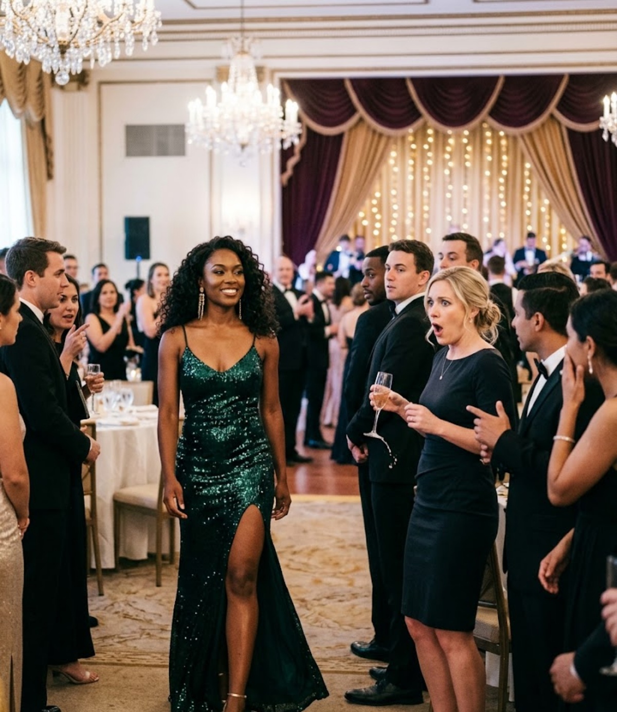 The dress was structured, expensive, severe in all the right ways — the kind of gown that does not ask for attention because it assumes it. The heels were red-soled and exact. Diamond light flashed once at her wrist. Her hair, a crown of natural curls shaped with editorial precision, caught the hotel lighting and made the air around her seem curated. She did not hurry. She did not look around uncertainly. She did not carry the posture of someone walking into a room full of old judges.