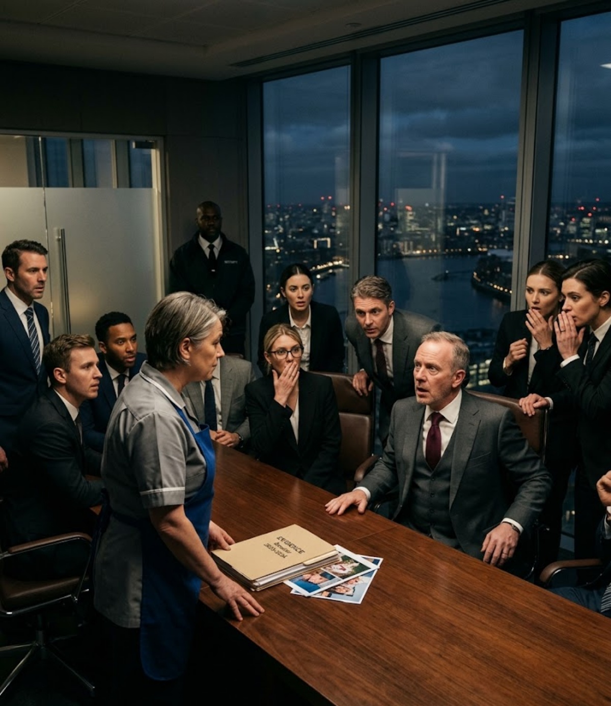 The woman who emptied wastebaskets, polished conference tables, cleaned fingerprints from glass walls, vacuumed executive offices after the men who occupied them had gone home to architect kitchens and wives who pretended not to mind the hours. Evelyn had grown used to the rhythm of invisibility. The quick little silence when conversations stopped because someone important had realized “the cleaning lady” was in the room. The thoughtless remarks people made when they assumed service workers were background music with pulse. The dismissive half-smiles. The impatient gestures. The way some people continued speaking about layoffs and bonuses and “low-level dead weight” while she wiped rings of cold coffee from the exact table where those decisions had been made.