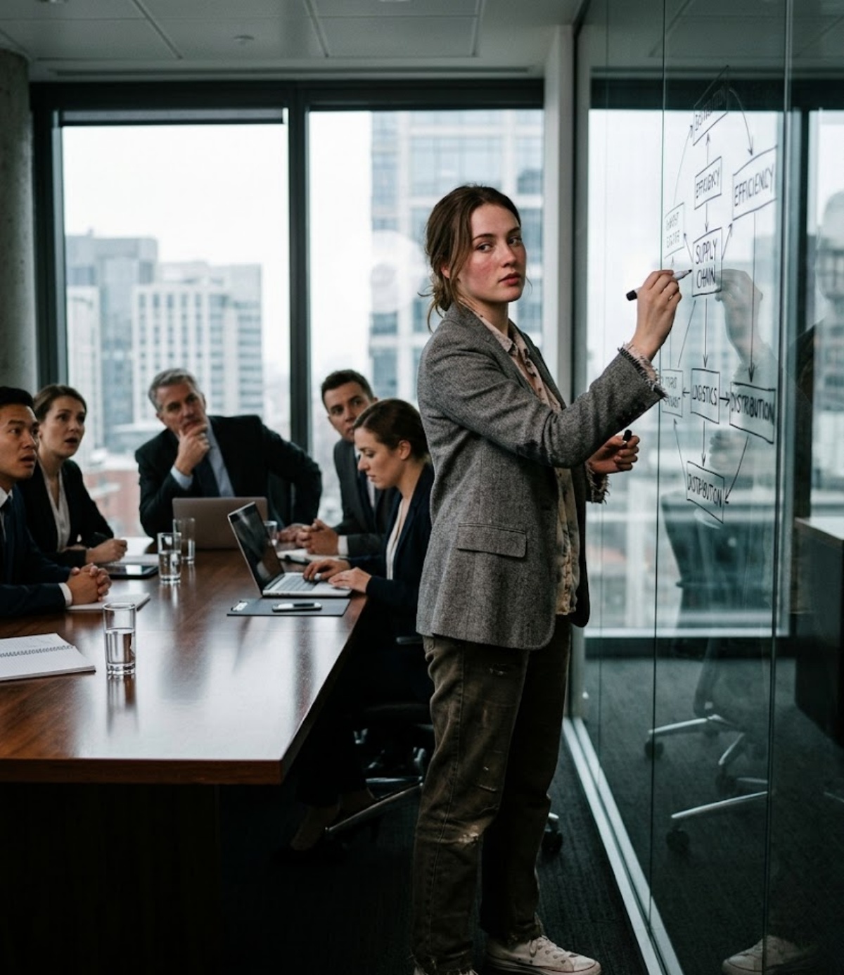 She stood at the glass and thought about the girl who had walked into this building months earlier with a typed résumé, a broken laptop, and shoes that told on her. Thought about the marker rolling across the floor. Thought about the laughter. Thought about the exact second something inside her had refused to break and chosen instead to become sharp.
