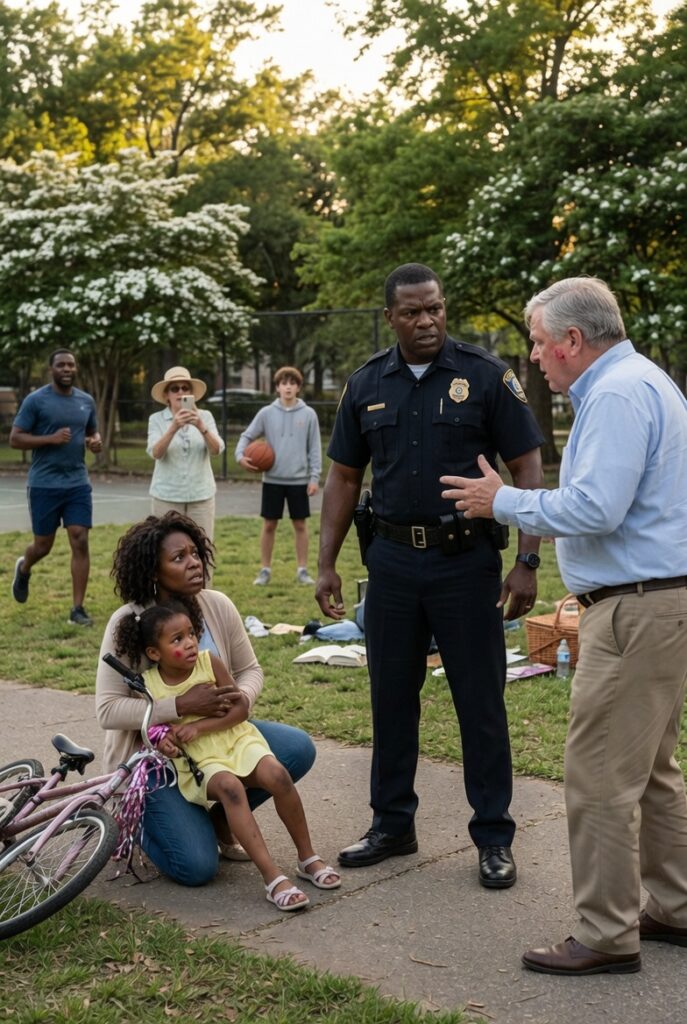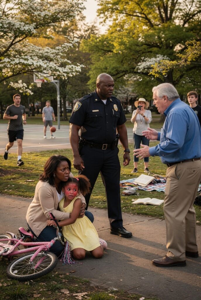 The laughter around the park didn’t stop all at once. It thinned first. Conversations faltered. A jogger slowed. A couple looked over from under the trees. A mother near the fountain pulled her toddler closer. Danielle rose from the picnic blanket before she fully understood what was happening, every instinct in her body already moving her toward her daughter.