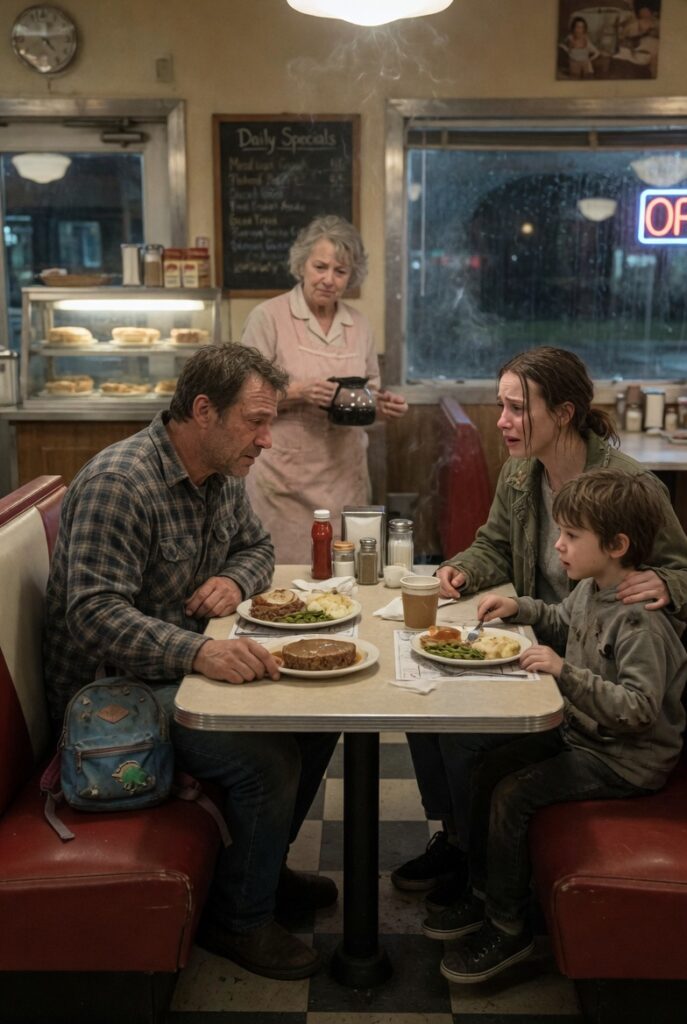 Marcus sat in the corner booth under the dim yellow glow of the diner lights, staring at the untouched plate in front of the empty seat. The meatloaf had started to crust at the edges. The mashed potatoes were losing steam. Outside, the cold pressed against the diner windows, making the glass look black and reflective. Inside, the place was quiet. A couple in the far booth. A trucker near the counter. Betty wiping mugs dry behind the register.