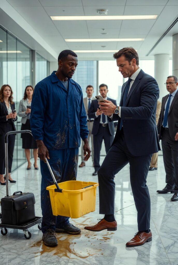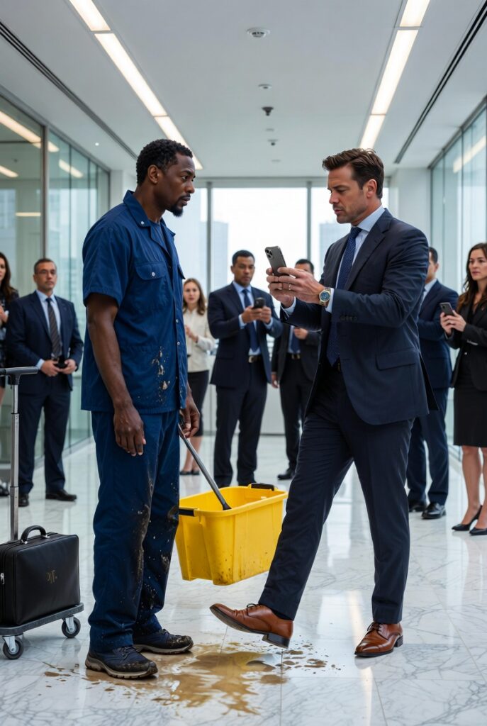 He stood over the overturned yellow mop bucket with his phone already in his hand, polished brown leather shoe planted in the puddle he had created, as if he wanted ownership of the mess as much as the moment. Dirty water spread in a shining arc, moving fast across the marble and soaking into the navy-blue work uniform of the man standing in front of him.