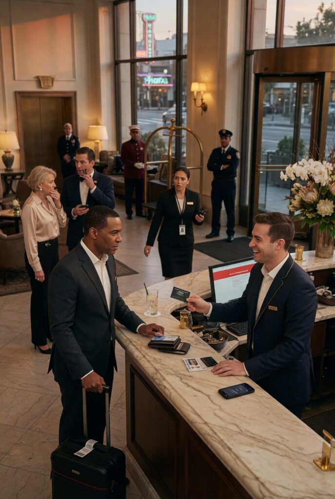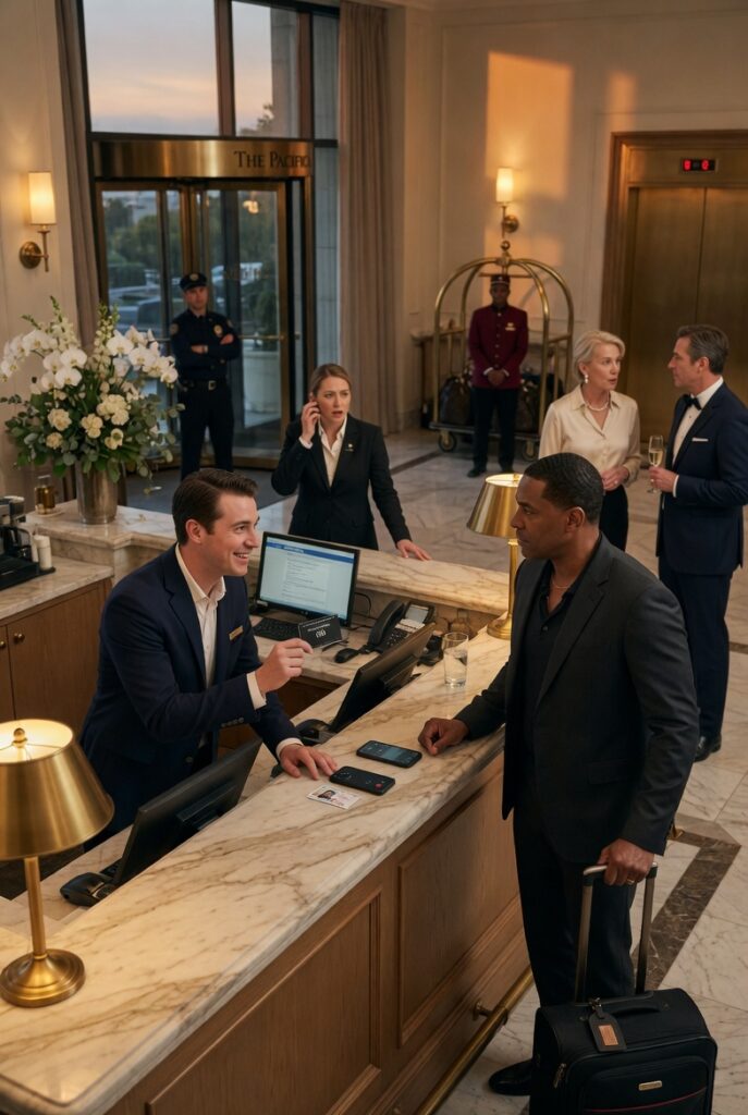 Conversations thinned. The polished rhythm of check-ins, valets, luggage carts, greetings, and elevator chimes suddenly felt brittle. A bellhop paused mid-step. A woman who had been signing something at the concierge desk stopped writing. The man who had laughed no longer looked amused.