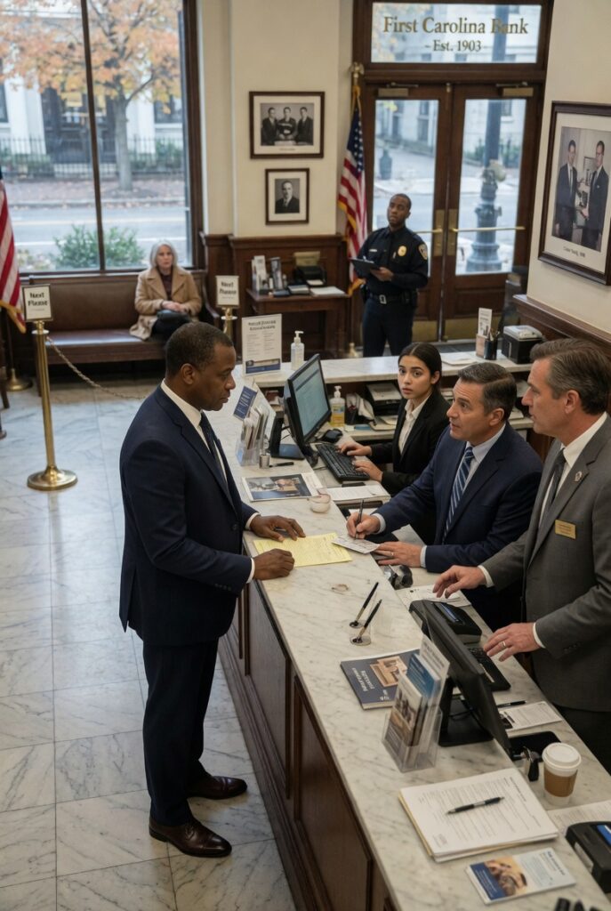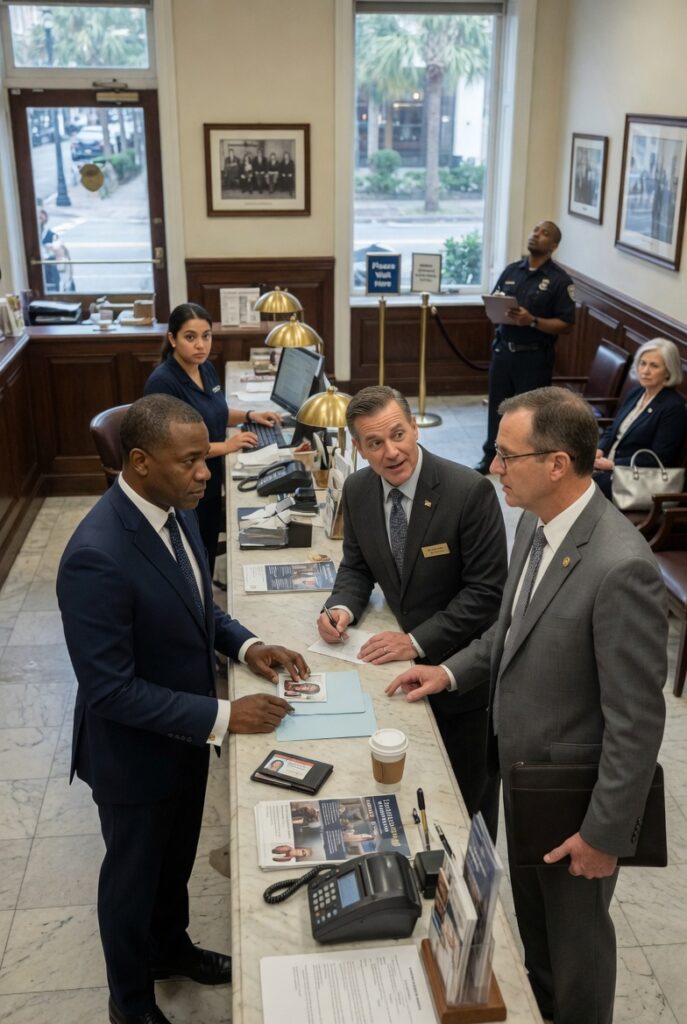 Keyboards clicked. Printers hummed. A teller laughed politely at something a regular customer said. Shoes passed over polished floors with soft, measured sounds. Conversations stayed low, the way they often do in places where money moves quietly and power rarely needs to introduce itself.