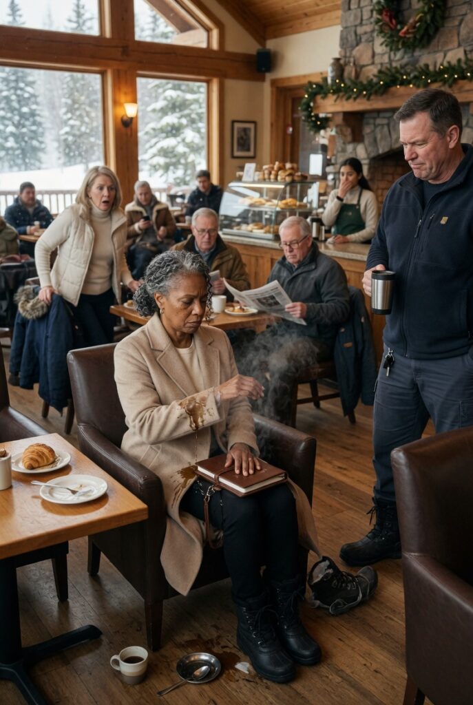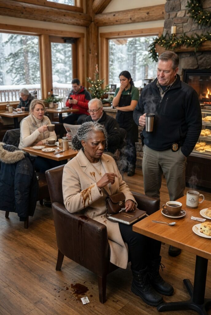 The liquid spread dark across the pale wool like ink across paper. Angela jolted, not with theatrical panic, but with the sharp involuntary shock of pain and disbelief colliding at once. The heat reached through the coat and bit into her skin. Her body tightened. Her lips parted. One hand instinctively touched the soaked sleeve.