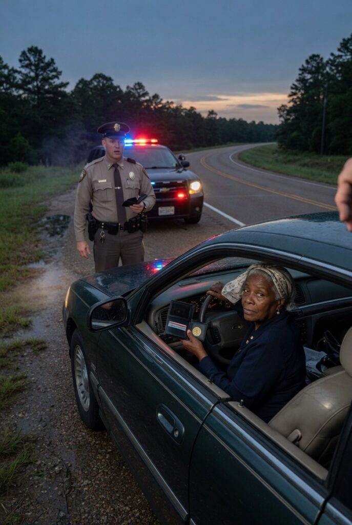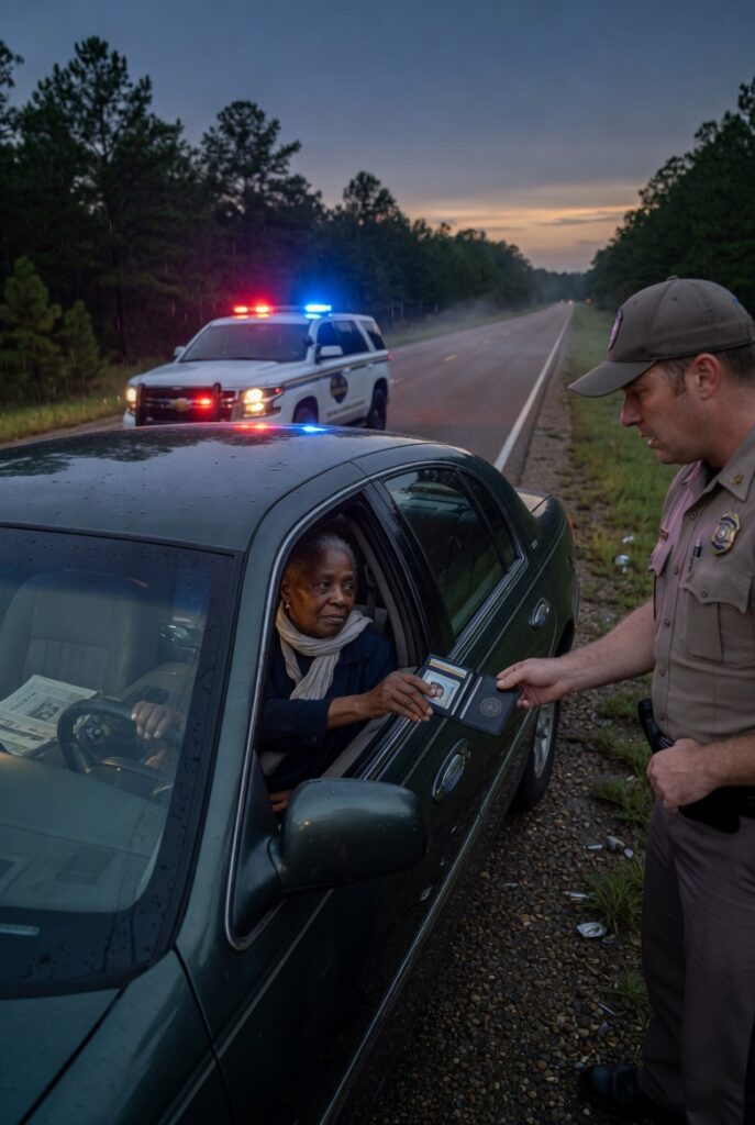 Red and blue strobes burst against the dark behind her, too close, too urgent, swallowing the road in flashing authority. The patrol cruiser came up fast and rode close to her bumper without using the siren, forcing the stop through intimidation rather than instruction.