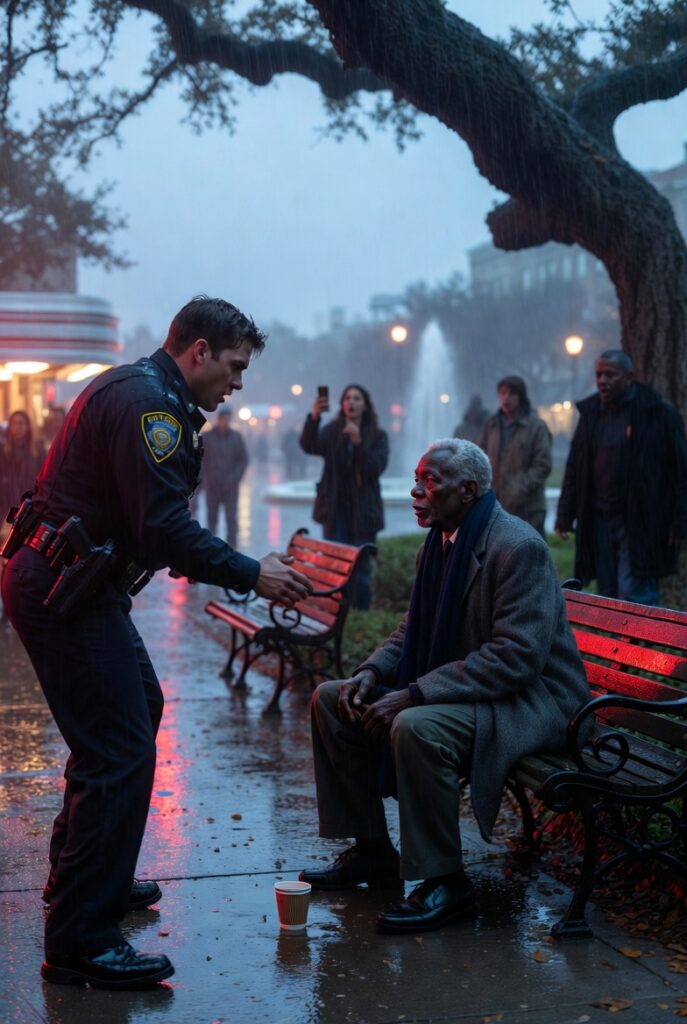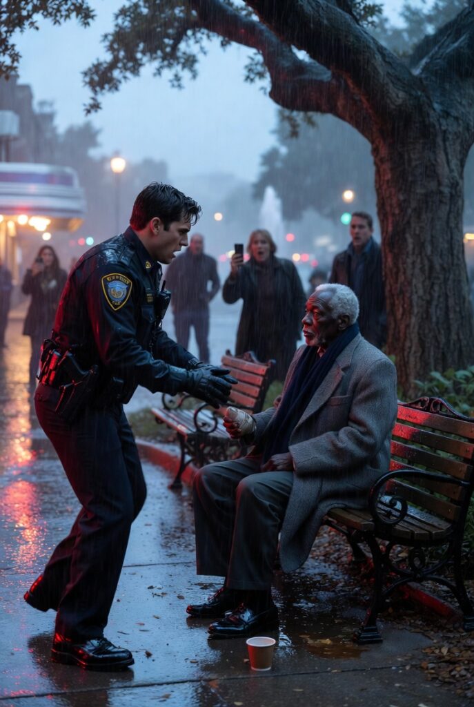 He stepped out of the cruiser and approached with a stride that announced confrontation before a word was spoken. Even from across the park, two teenagers near the fountain looked up. A woman walking her terrier paused. The atmosphere changed with that familiar, sickening speed that only happens when everyone recognizes that something unnecessary is about to happen but no one knows whether speaking up will help.