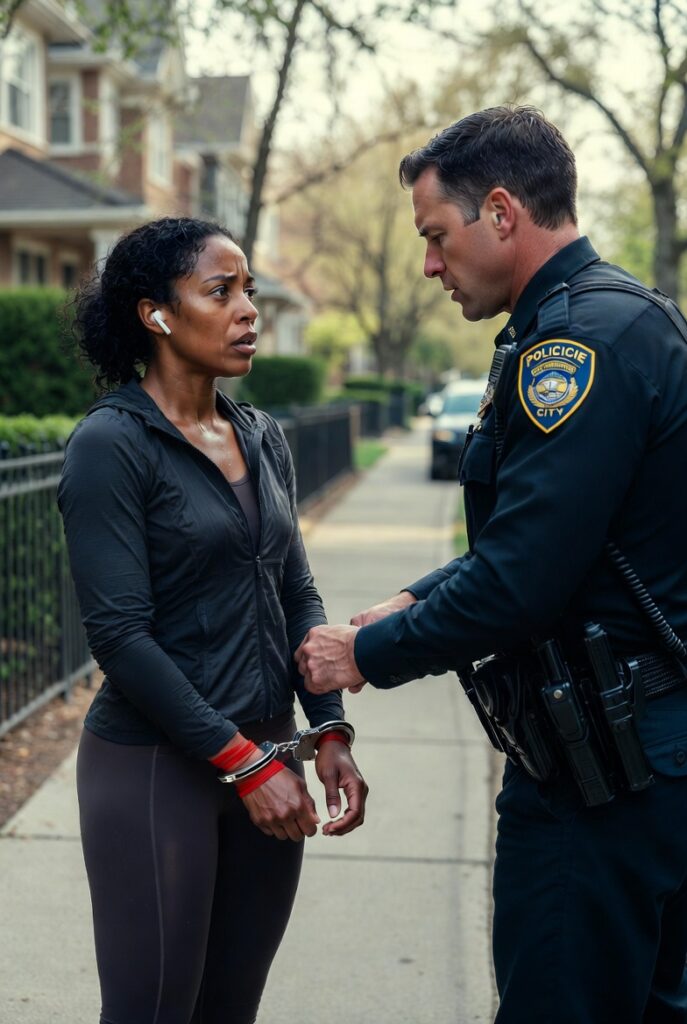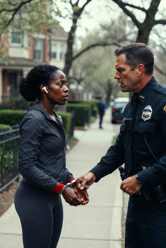 She was jogging at a steady pace beneath a row of budding trees, dark curls pinned back, skin glowing with sweat, her shoulders loose, her stride even. She wore fitted running gear, good shoes, wireless earbuds, and the expression of someone fully at ease in her own body and in the space she occupied. She did not glance anxiously at the patrol car. She did not shrink or stiffen or look over her shoulder as if asking permission to exist in the neighborhood.