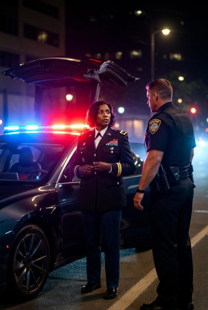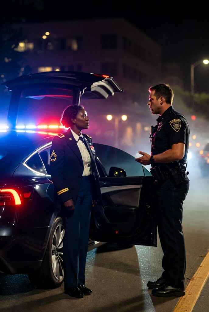 She opened the door slowly and stepped out into the Georgia night, hands visible, posture exact, every movement restrained. The faint scent of rain and magnolia drifted between the flashing lights. Her face was still. Not cold. Not angry. Just disciplined. The kind of discipline built over years of learning how to survive pressure without surrendering clarity.