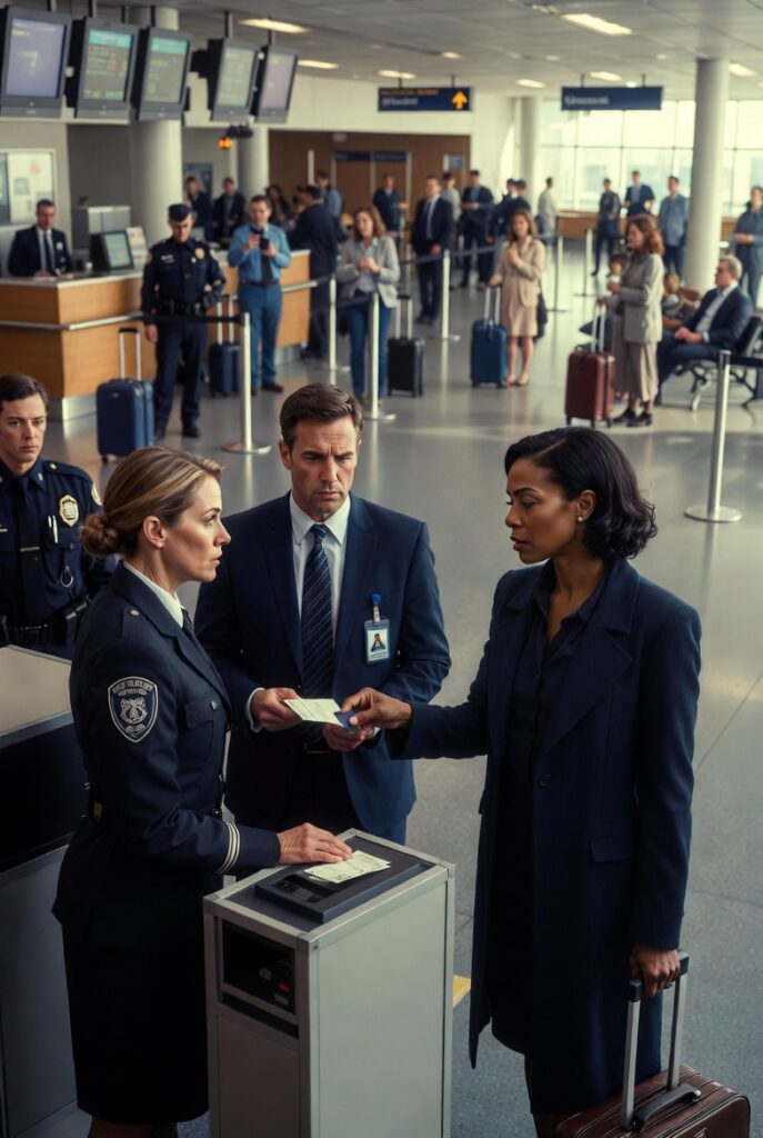 She reached into her bag slowly and pulled out her driver’s license and printed confirmation. Officer Mason checked them carefully, then looked at the screen, then looked back at the gate agent.
