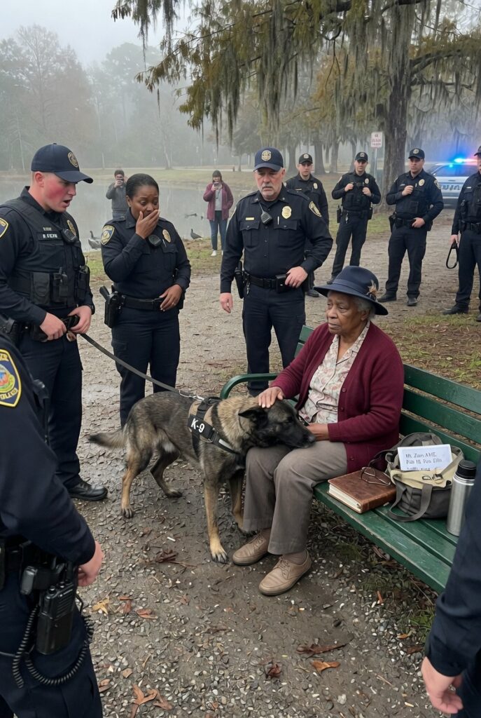Officer Terrence Cole led the group, late fifties, veteran face, voice trained to sound calm even when authority had already made its mind up. Beside him came Officer Brett Langley, young enough that his confidence still looked brand-new on him, his Academy sharpness unsoftened by self-doubt. Behind them walked Officer Dana Morales, one hand on the leash of Diesel, the department’s Dutch shepherd, all muscle and discipline and state-approved menace.