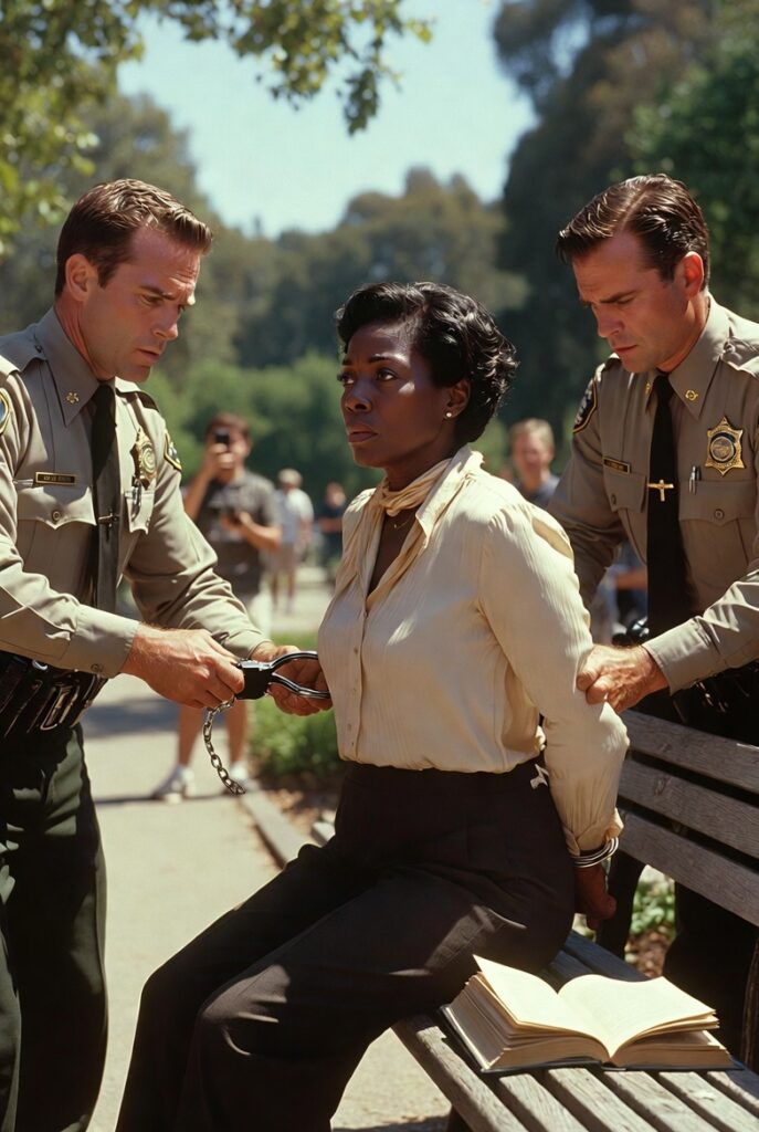No emergency. No threat. No urgency. Just two men escorting a Black woman in handcuffs through bright afternoon sunlight because someone had decided her quiet looked suspicious enough to punish.