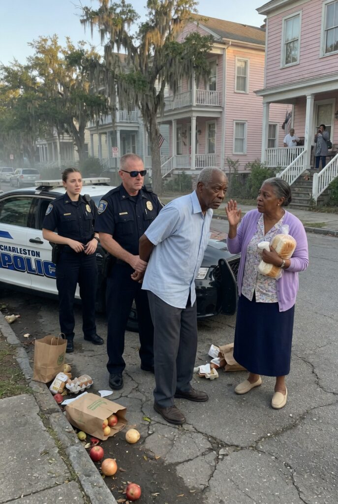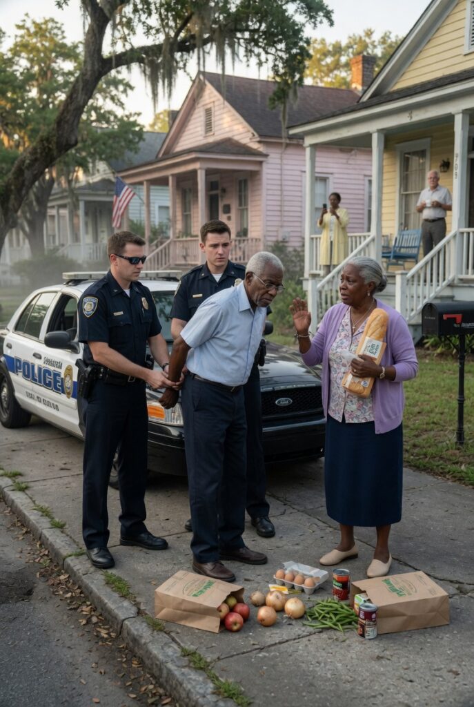 Levi bent slowly. Age had made his knees honest. Every movement took care. He lowered the bag to the cracked sidewalk, careful not to crush the fruit. Clara stayed beside him, chest tight, eyes fixed on the officers as if trying to understand how a lie had already become force.
