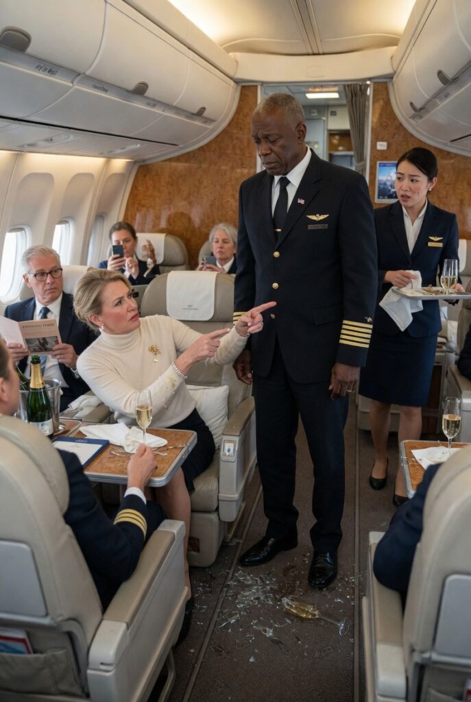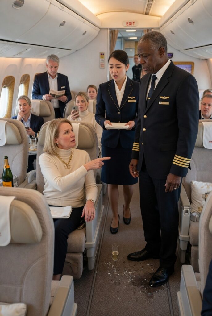 It slipped from manicured fingers, struck the carpet near seat 1A, and exploded into glittering fragments under the soft gold light of the first-class cabin. The sound was sharp enough to stop conversation, but not nearly as sharp as the silence that came after.