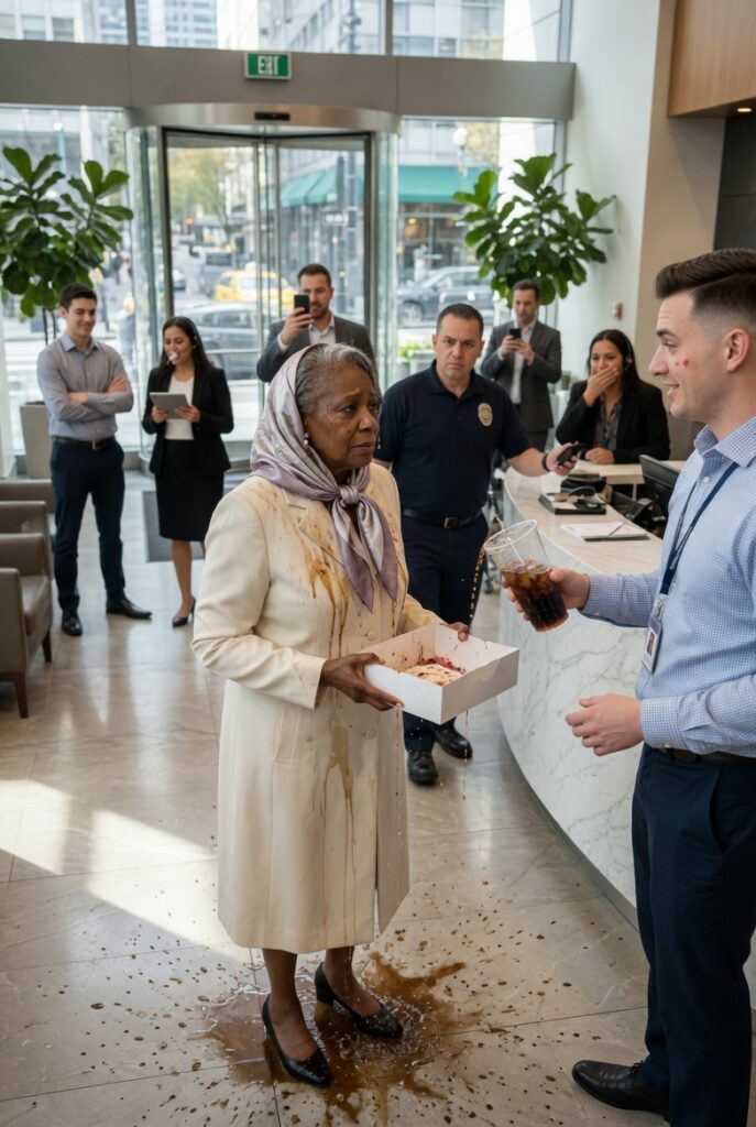 He took in the scene quickly — the soaked woman, the sticky floor, the phones, the snickering employees — and somehow managed to frown not at the people who caused it, but at the woman standing inside the mess.