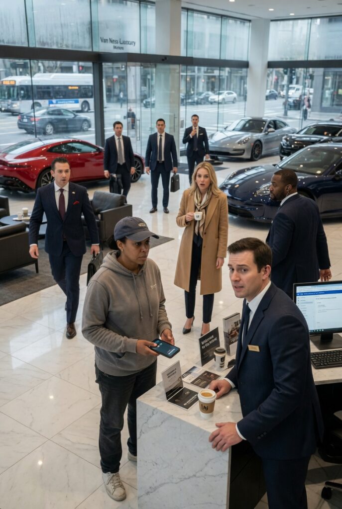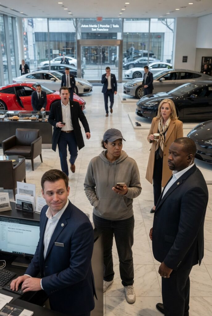 The flagship dealership on Van Ness Avenue rose ahead of her like a temple built for aspiration. The front windows revealed Aston Martins lined under cool white light, a row of sleek hybrid sports models arranged on black platforms, and staff in fitted suits moving with the practiced choreography of people trained to make wealth feel personal.