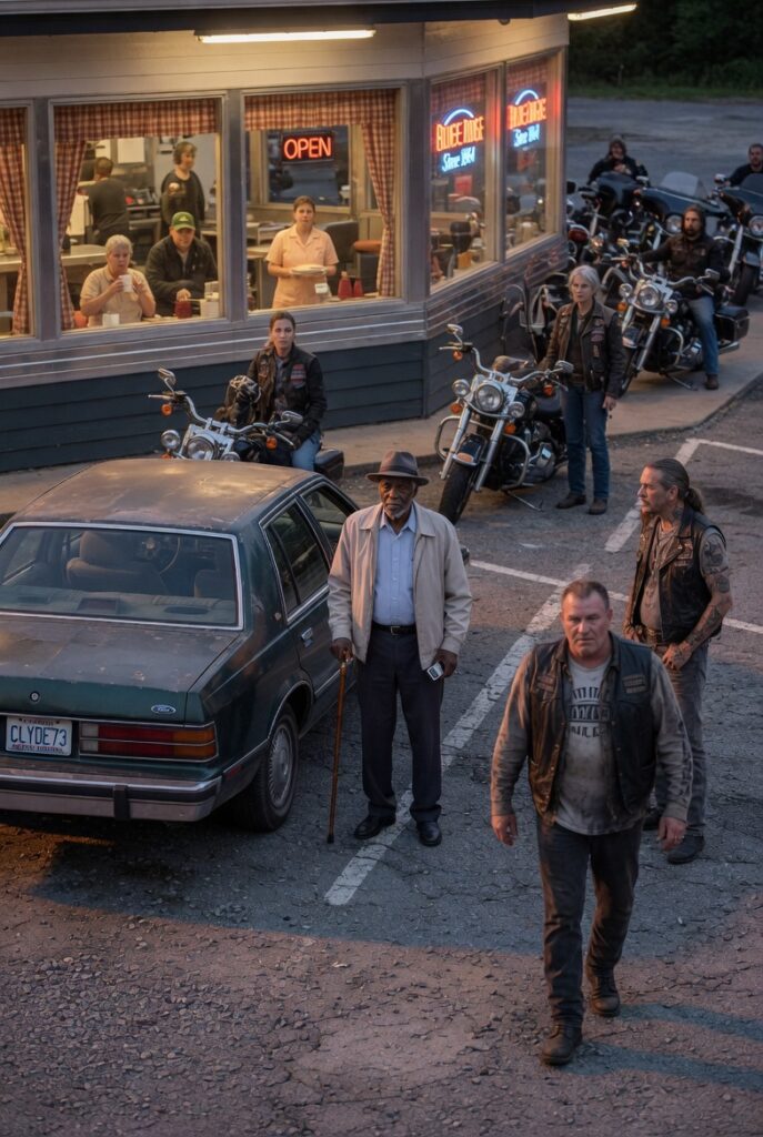 Cole took a few steps forward. Gravel crunched beneath his boots. Two of the others spread out behind him like they were closing a circle. Through the cafe windows, a few customers turned their heads. A waitress paused near the register. Someone at the counter leaned sideways to see better.