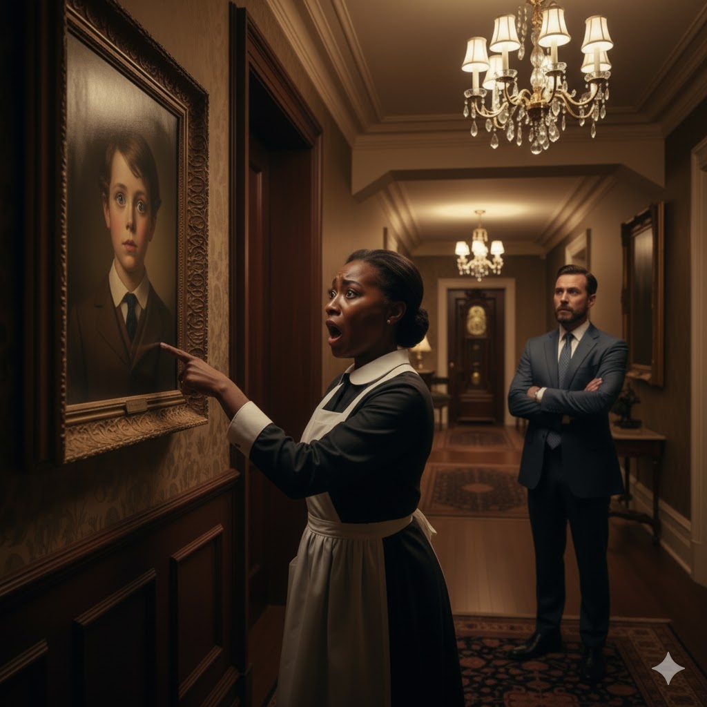 One afternoon, a new housemaid named Amara, a gentle Black woman in her early fifties, paused in the hallway near a portrait. It was a painting of Leo as a child—wide eyes, soft expression, holding a toy airplane. Ethan rarely looked at it anymore, but he kept it there because removing it felt like abandoning hope completely.