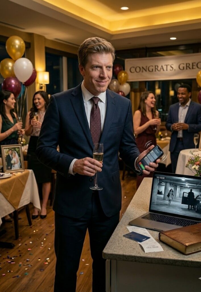 Ryan did not go home that night. That decision, small on the surface, became the first smart move in a week full of them. Instead of driving back to West Lake Hills and confronting Lauren while rage was still fresh and Trevor’s tie-adjusting face was burned into his brain, he texted her that he was working late and booked a hotel near the office. She replied almost instantly with a casual, affectionate “Okay, love you,” and Ryan sat on the edge of that hotel bed staring at those words until they stopped feeling like language and started feeling like mockery. He ordered room service and didn’t touch it. He turned his phone off and sat in the dim light with the city outside the window and the ugly clarity that sometimes only arrives after an image destroys denial. Because this was not a suspicion anymore. Not a weird feeling. Not a wrinkle in a dress or a missing charger or a dead phone battery explained badly. It was footage. Time-stamped. Silent. Mechanically objective. The kind of proof that doesn’t care what story anyone tells later. And the more Ryan replayed it in his head, the more he understood that what hurt most wasn’t just that Lauren had cheated. It was that she had done it during his promotion party, with the man whose career he had personally lifted, and had then walked back upstairs to smile beside him while he thanked her in public. Some forms of betrayal are so specific they feel handcrafted.