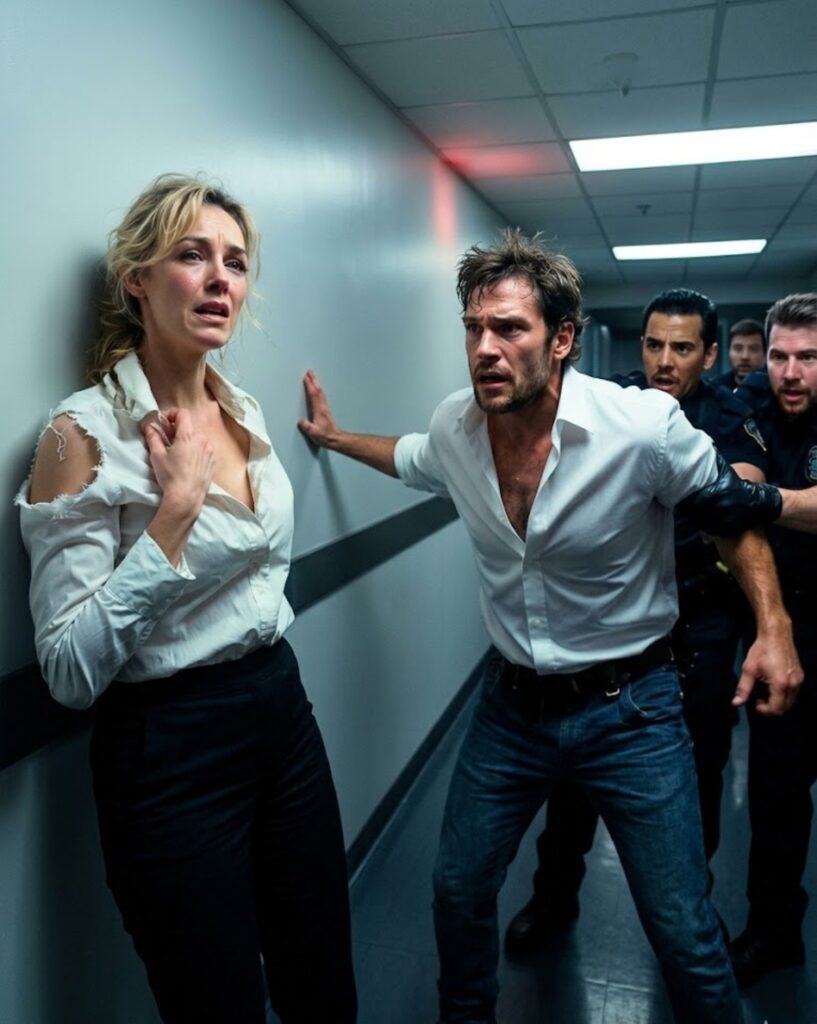 She stood directly beneath the camera as if she had measured the frame in advance. Slowly, almost thoughtfully, she reached up and loosened one more button on her blouse. Then she dragged her fingers through her hair, disturbing it just enough to suggest panic without ever becoming messy. When she raised a hand to cover her mouth, she looked like a woman fighting back tears. Anyone reviewing the footage later would think the same thing first: something terrible had just happened behind that door.