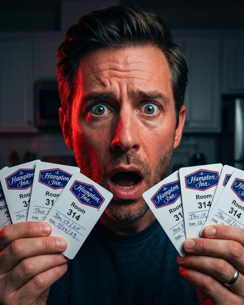 Five cards total. All Hampton Inn. All room 314. I laid them out on the counter in a neat row because even in crisis, some part of me still wanted information arranged before panic. They looked innocuous sitting there under the kitchen lights—small, clean rectangles of plastic with no moral weight except the one my mind had already begun attaching to them.