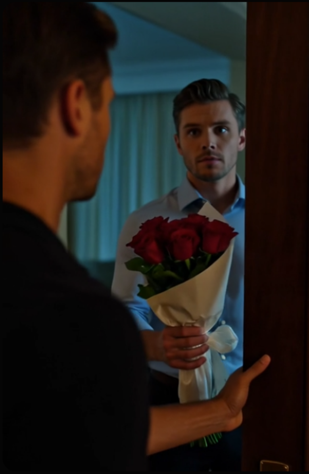 I bent down and picked the bouquet up off the floor. The stems were bent. Several petals had broken loose and scattered across the carpet. I stared at the flowers in my hand for a second longer than I meant to because they suddenly seemed so ridiculous. I had bought them because some part of me wanted to still be the good husband in the story. There is something cruel about realizing the last decent instinct in you arrived holding roses while the truth waited barefoot on the other side of a hotel door.