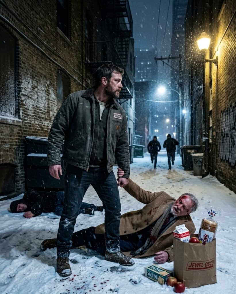 By the time Daniel Carter turned into the alley behind Halsted Street, the city had already gone soft with snow. It had been falling since the afternoon, thick and steady, the kind that dims headlights, swallows footsteps, and makes Chicago feel farther away from itself than it really is. Storefronts had gone dark. Metal shutters were down. The wind pushed loose wrappers and powdered ice along the brick walls in small frantic circles. Daniel was carrying a grocery bag in one hand and the weight of an eleven-hour day in the other.