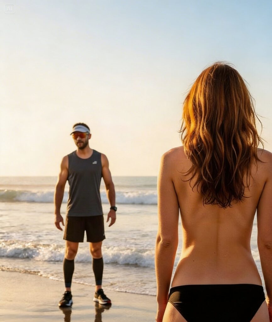 The sea was still wearing the pale blue of unfinished morning when Oliver Thompson came around the curve of the rocks and saw her. Until that second, the beach had belonged to the simple mathematics of breath, stride, salt air, and discipline—the kind of private order he always tried to preserve during vacations because routine, for him, was never vanity. It was structure. The sand was cool beneath his feet, damp enough to support the rhythm of his run, and the breeze coming off the water carried that clean mineral scent that makes the coast feel older than human embarrassment, older than ambition, older than the kinds of secrets people spend years learning how to hide.