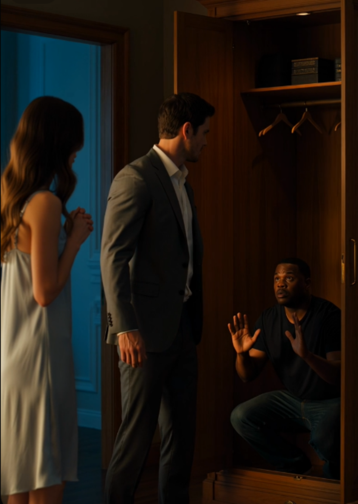 A shirtless man stood inside pressed awkwardly between Michael’s hanging dress shirts and a stack of winter sweaters. He had one hand clenched around a phone as if he’d been in the middle of sending a message. His jeans were half-buttoned. His expression was frozen in the wide-eyed, animal panic of someone who had run out of exits.
