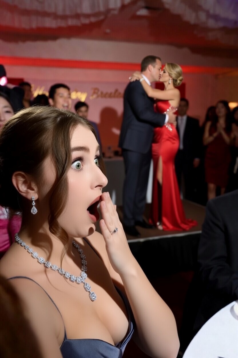 Ryan was holding a microphone, smiling with that smooth, public face men often reserve for moments when they think the room belongs to them. His suit was perfectly tailored. His posture was relaxed. He looked not nervous, not guilty, but triumphant. Beside him, looped into his arm, stood Lauren—his secretary—wearing a white designer gown that did not whisper subtlety so much as announce its own ambition. She leaned into him with practiced softness, the kind that knows exactly where every camera in the room is likely pointing.