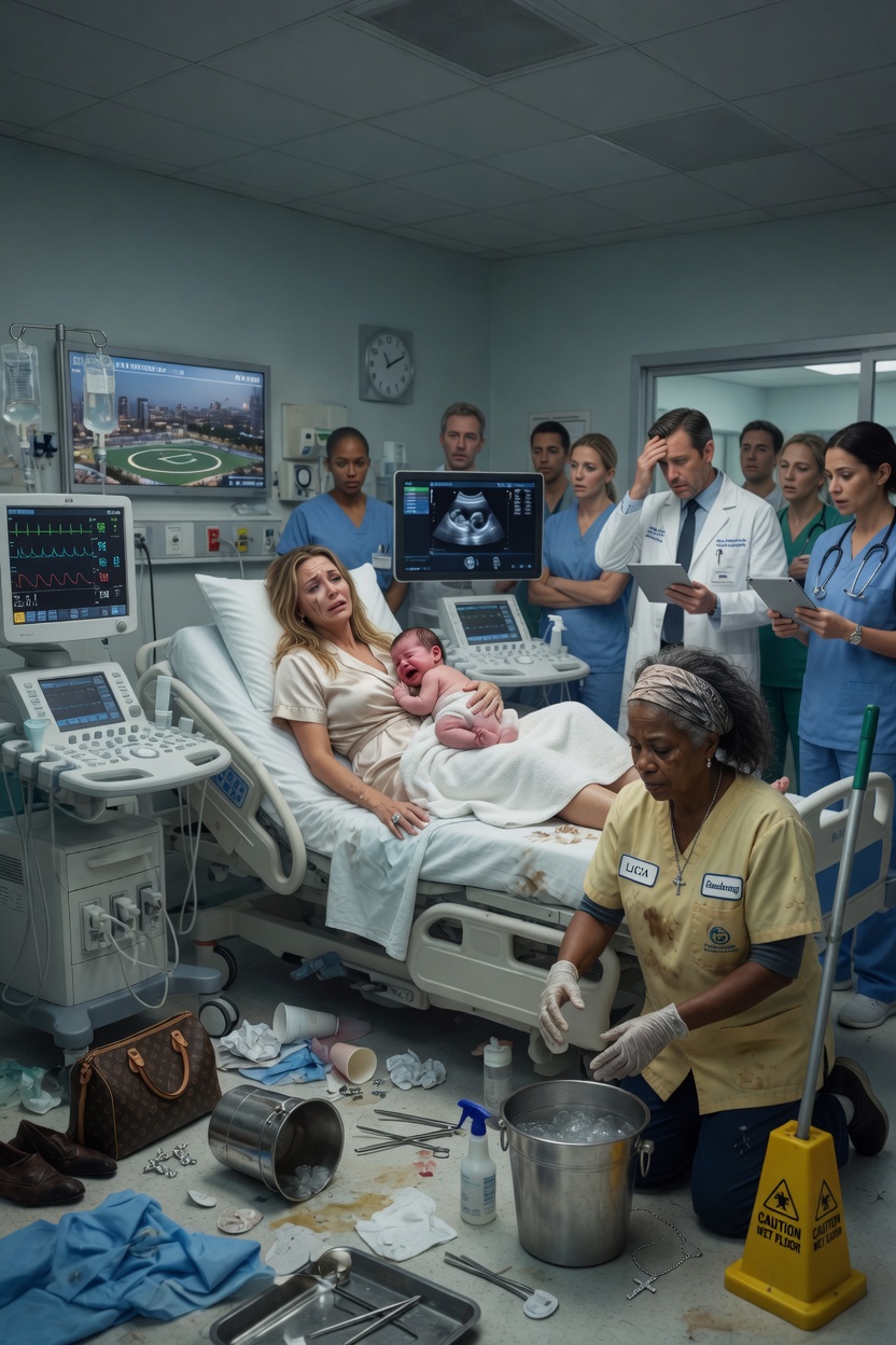 She had known for hours that something was wrong. Not because anyone told her. No one ever told women like her anything important. But she had been cleaning that wing since dusk, and she had ears. She had heard the pattern of voices change: the early cheerfulness, the strained optimism, the first edge of concern, then the clipped conference tones doctors used when they were trying not to say fear out loud. She had heard requests for anesthesia, for ultrasound, for labs repeated twice because no one had time to wait. She had watched nurses come out with blood-specked gloves and tired eyes, watched specialists arrive in tailored coats over evening clothes, carrying leather bags and authority.