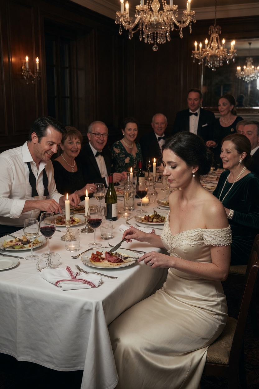 In the powder room off the main hall, I locked the door and looked at myself in the mirror. The dress had been ivory when the night began. Now the silk bloomed dark crimson across the bodice like a wound opening underwater. My mascara had held. The wine had caught in the fine hairs near my ear. One drop hung from the pearl on my left earring.