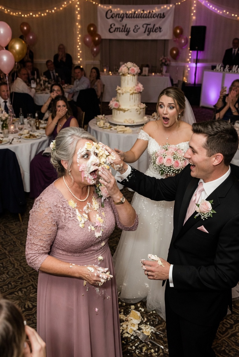 It hit the back of her throat before the humiliation fully registered—thick white frosting, too sweet, too soft, packed into her mouth and pressed hard across her nose and cheekbones until she could not breathe properly for one disorienting second. The room reacted in fragments. A woman near the champagne tower gasped. Someone laughed too soon, the way people do when they are not sure whether they are witnessing a joke or the beginning of something ugly. A fork clinked against china. Somewhere behind the string quartet recording, a child asked a question and was immediately hushed.