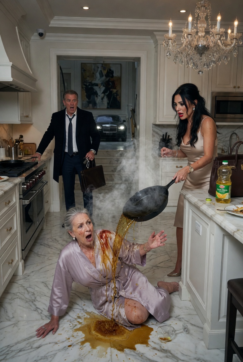 By the time he reached the sitting room, his pulse was already hammering in his throat. The air changed before the scene fully made sense. It was thick with hot oil and the faint, sickening smell of skin beginning to burn. The television was still on in the corner, some daytime program talking cheerfully over the sound of agony, and in the middle of the room his mother sat twisted in her wheelchair, wrapper darkened, chest and lap slick with oil, hands shaking so badly they could not even find where to hold.