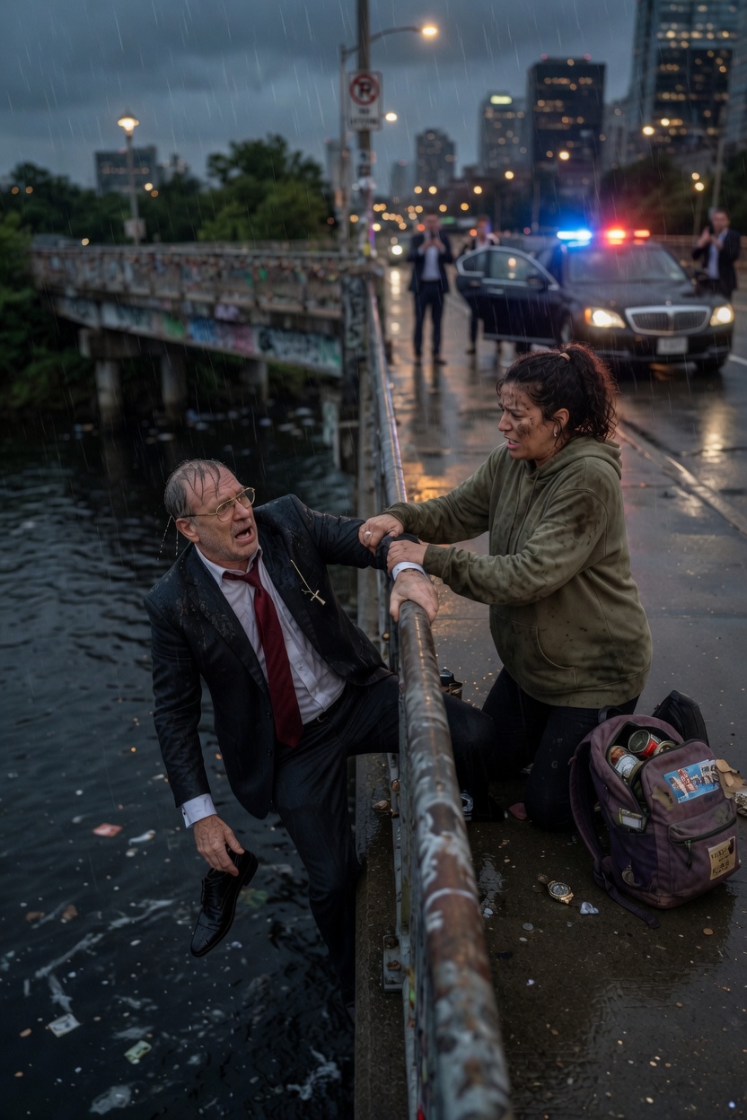 She shoved between two men in office coats and reached the railing just as another cry tore upward from below. A man in a dark suit was hanging on the outside of the bridge, his hands locked around the cold metal barrier, his body suspended over the river like a dropped thing that had not yet accepted gravity. One polished shoe scraped uselessly against concrete. The other kicked at open air. His face was turned upward, gray with shock, jaw clenched so hard the muscles stood out beneath the skin.
