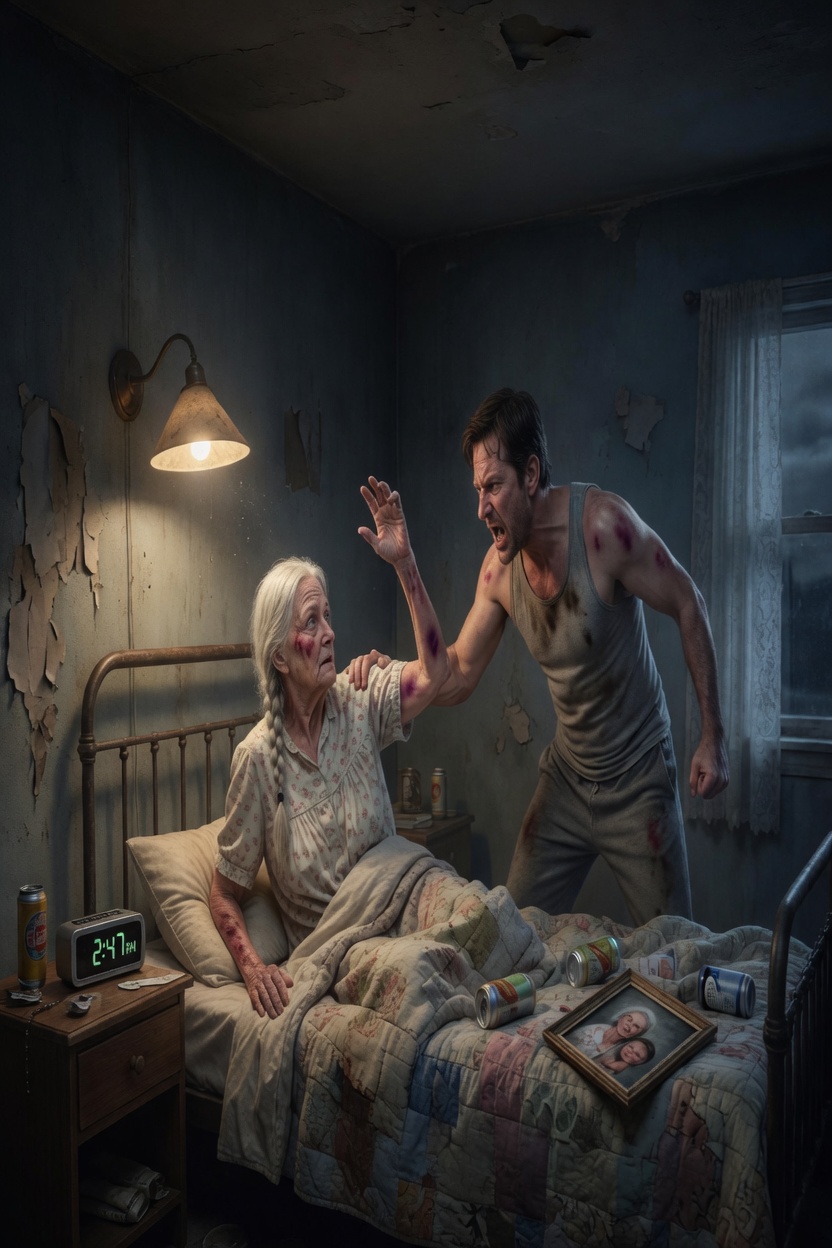 Her head snapped sideways. A burst of light flashed behind her eyes. She tasted blood immediately—bright, coppery, intimate. Her ear rang. For a second there was no room, no son, no night, only the deep animal shock of being struck by the child she had once held feverish against her chest and begged God not to take.