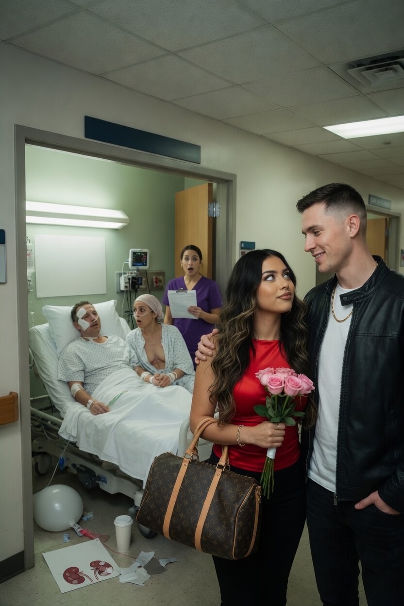She had on a fitted blue dress he had never seen before, a color too deliberate for a weekday visit to a recovery ward. Her lipstick was fresh. Her hair was pinned back in a way that made her look polished and expensive. The man beside her, Derek Okafor, had the clean, pressed look of someone who never lifted anything heavier than a leather briefcase. Charcoal suit. White shirt. Watch that caught the fluorescent light. The air changed when they entered, expensive cologne cutting through antiseptic and bleach.